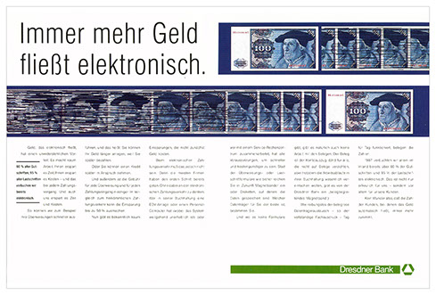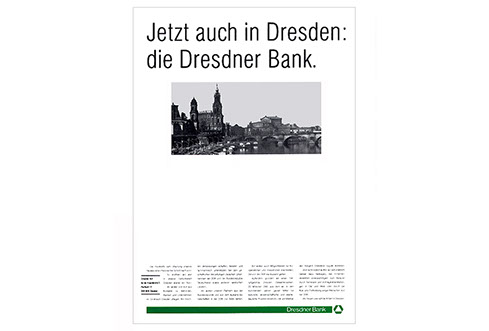 die idee zu dieser anzeige entstand am 9. 11 1989. so hatte die bank schon eine woche später in einem hotelzimmer mit telefonanschluss eine filiale in dresden und die anzeige dazu.