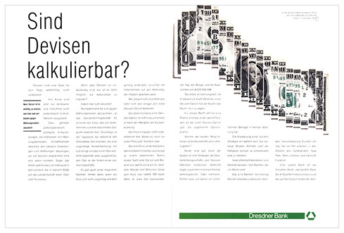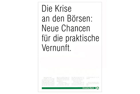 diese erste anzeige war eine schnelle reaktion auf den börsencrash 1987. zum erstenmal ging eine bank nicht in deckung, sondern zeigte sich. der erfolg: sympathie und respekt.