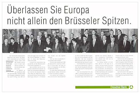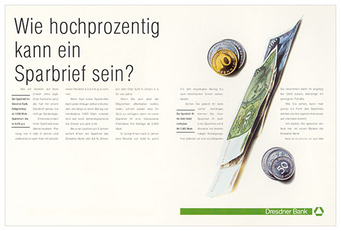 die idee zu dieser anzeige entstand am 9. 11 1989. so hatte die bank schon eine woche später in einem hotelzimmer mit telefonanschluss eine filiale in dresden und die anzeige dazu.